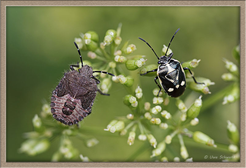 Links Larve der Beerenwanze, Dolycoris baccarum, rechts die Kohlwanze, Eurydema oleraceum
